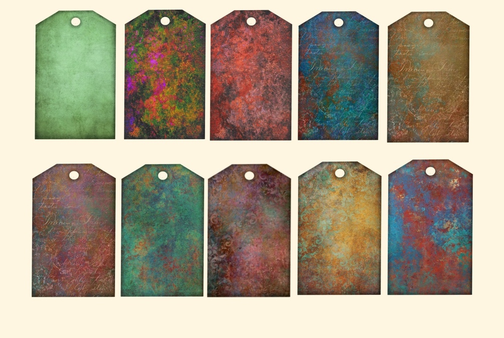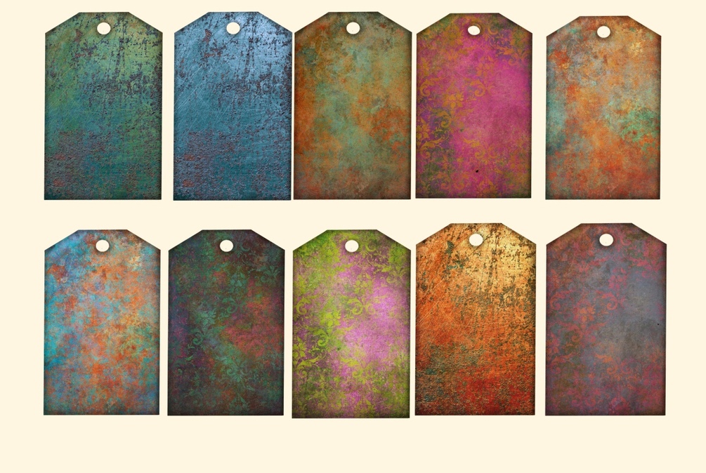 Grunge tags, rust, motifs, writing, old paper, scratches create the beautiful character of these tags. Great for art journaling, scrapbooking, mixed media journals and more.